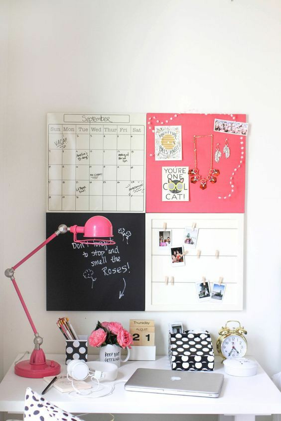 En el primero se ha usado unas cartulinas para diferenciar los temas y en mi caso una manta de yoga de espuma rosa que ya no me servía. Para diferenciar los dos lados, he utilizado cinta de dibujos. El resto es una lámpara de escritorio y una mesa. En ella puedes incorporar lo que quieras: un jarrón con flores artificiales, una taza para tus bolis, calendario, reloj. Yo he añadido una impresora. También puedes emplear los típicos tableros de espuma o una pizarra blanca borrable. Que siempre viene bien. Pero recuerda dejar un espacio suficiente amplio para trabajar en tu ordenador de forma cómoda. Aquí te dejo algunas de las cosas que yo he empleado para que las puedas comprar.