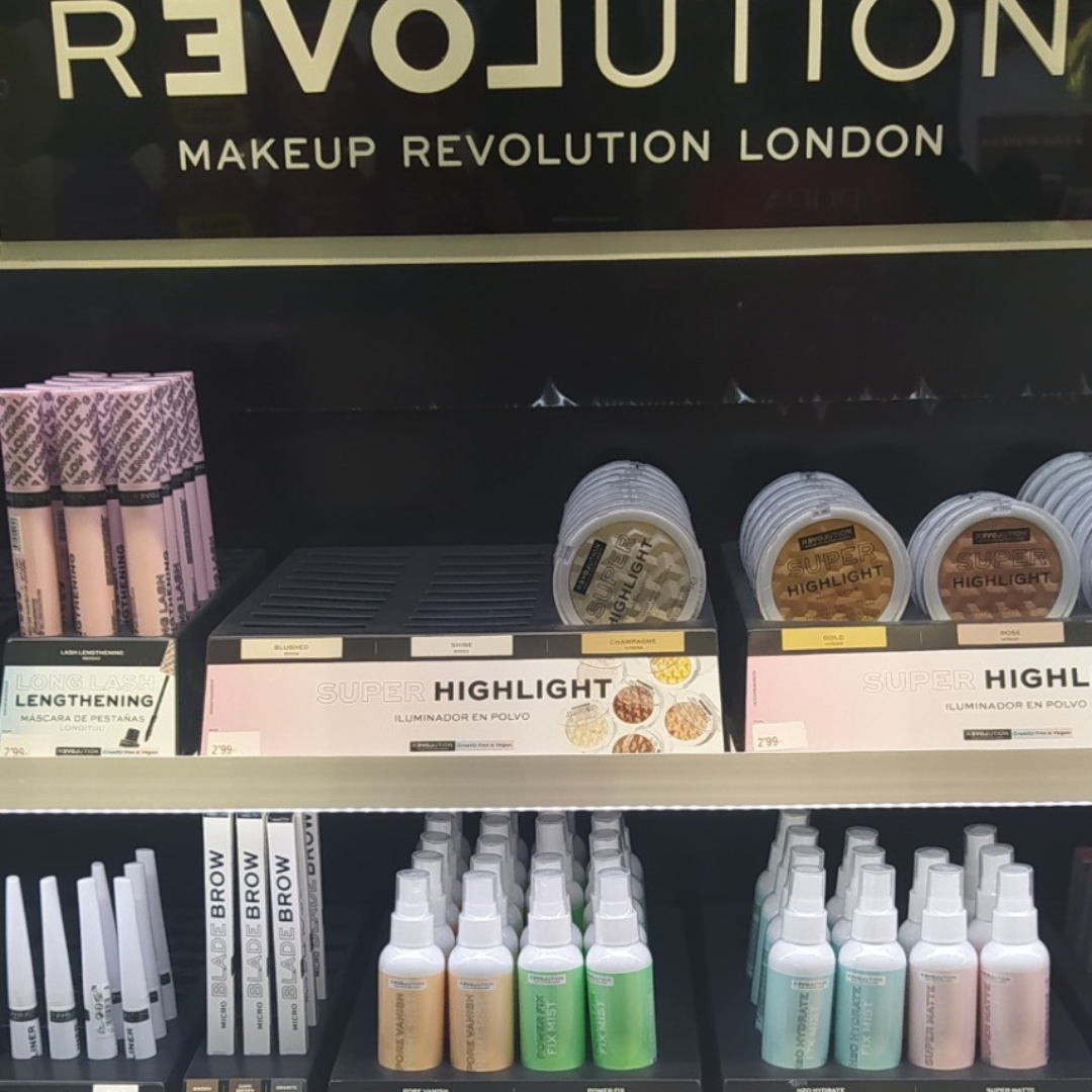 Make rvolution London. Como reza en la foto del mueble tomada por mí. Esta firma de maquillaje nació en Londres en marzo de 2014. Su apuesta de mercado: productos con una calidad extraordinaria, a precios revolucionarios. Y con una presentación divertida inspirada en los comics de Marvel, Dc y otros personajes animados. ¿Qué pensabas Curly? Claro que visito las tiendas y pruebo los productos para daros la mejor información.